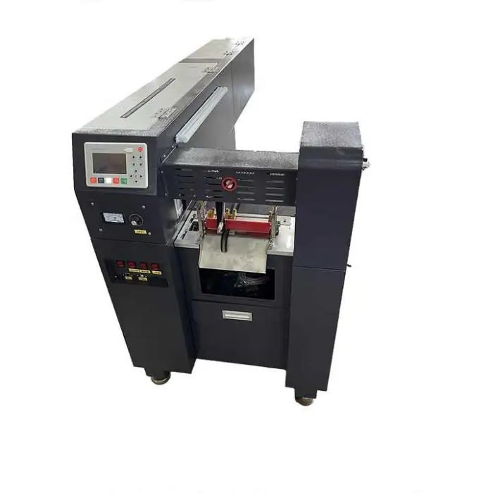 The machine is versatile and can handle a variety of materials including textiles, ribbons, webbing, and packaging materials.