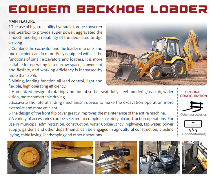 The Backhoe Loader GEM388 includes safety features such as a ROPS (Rollover Protective Structure), safety alarms, and a secure operator's cabin.