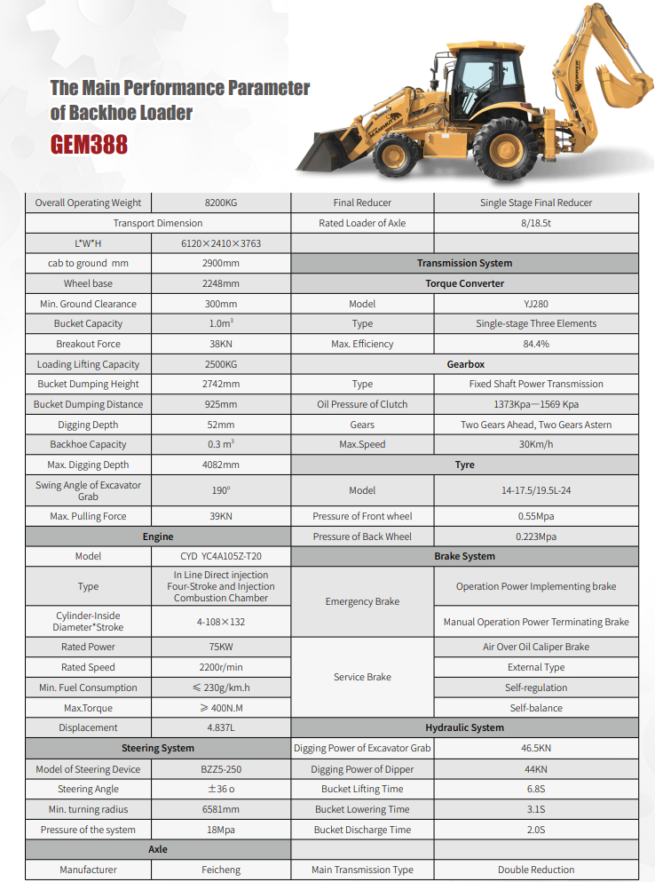 2. What are the key specifications of the Backhoe Loader GEM388?