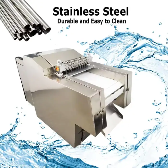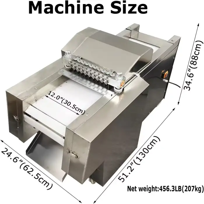 The machine can cut meat in lengths ranging from 0.59 inches to 1.97 inches (15 mm to 50 mm).