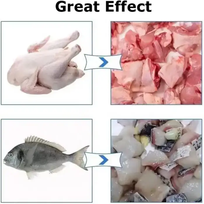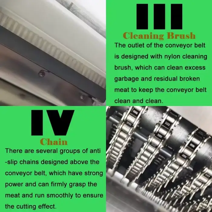 The Bacon Sausage Beef Cutting Machine is suitable for fresh and microfrozen poultry, all kinds of meat, including pork chops, steaks, and ribs.