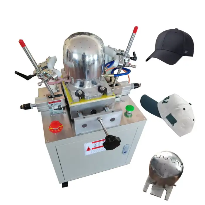 The machine is designed for 5 and 6 panel caps, making it ideal for processing popular hat styles.