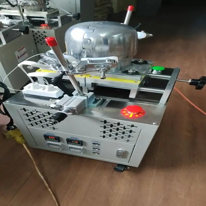 The Basketball Caps Ironing Machine operates pneumatically, allowing for smooth performance.