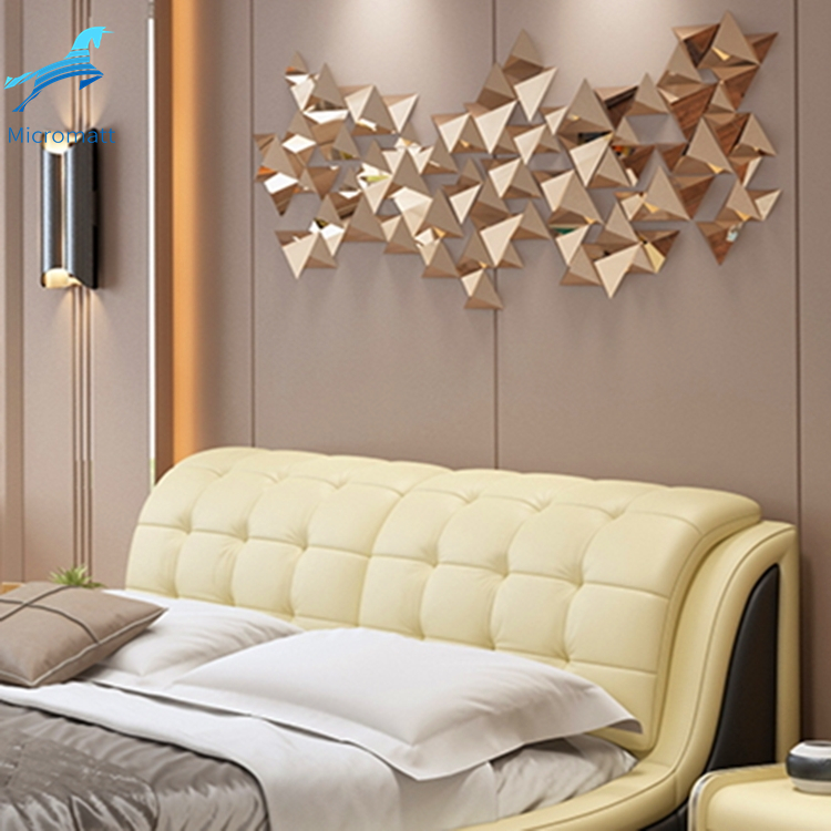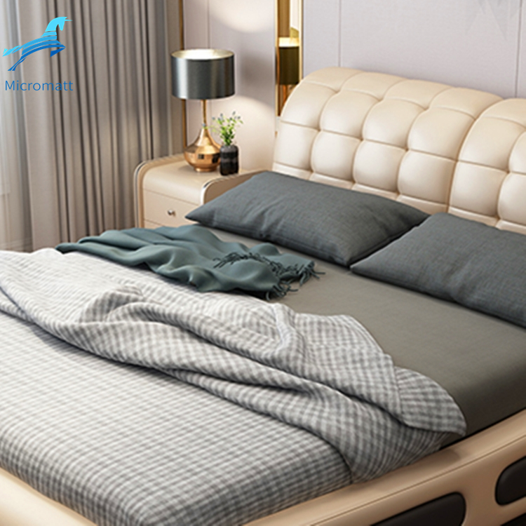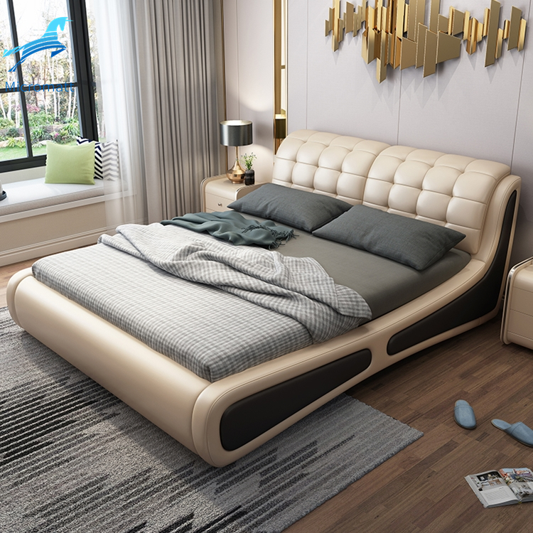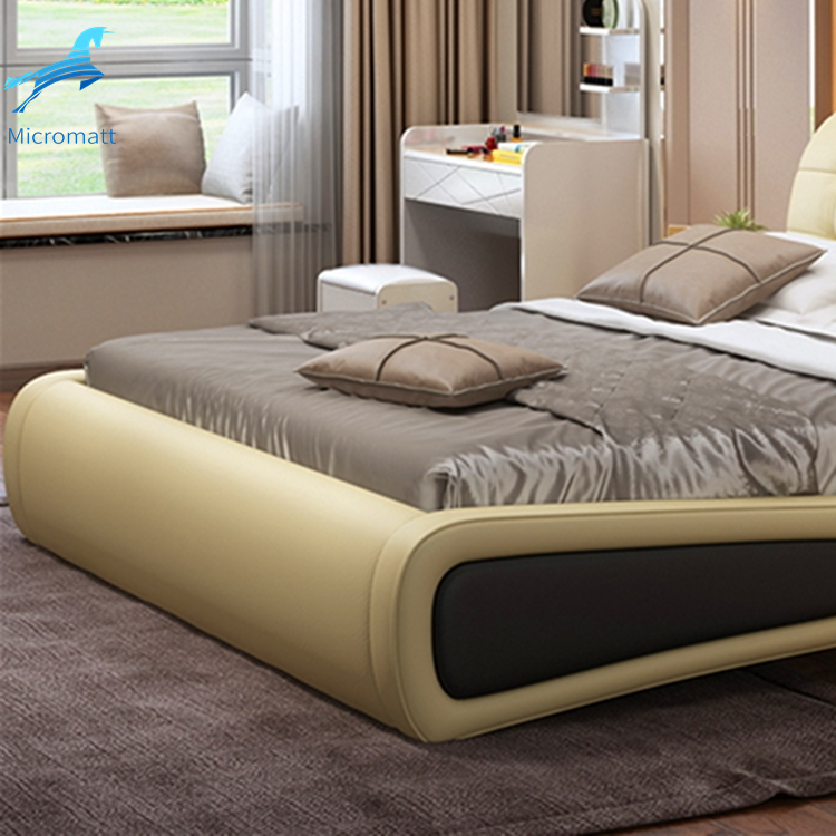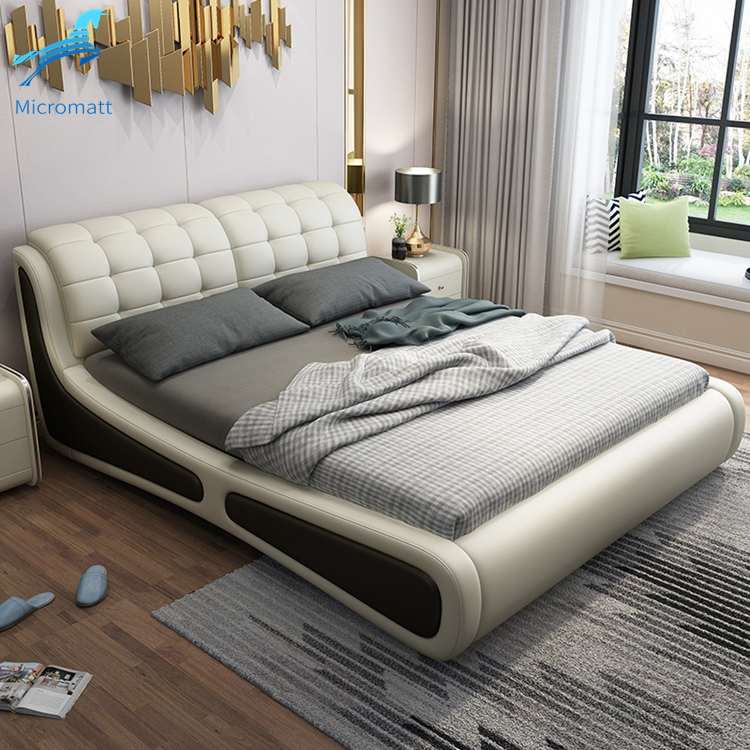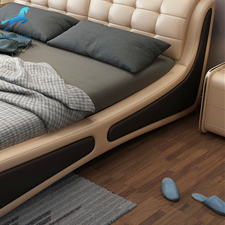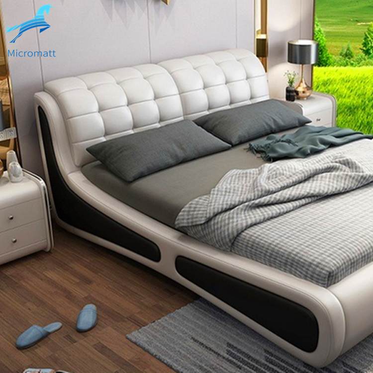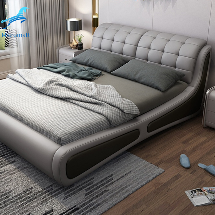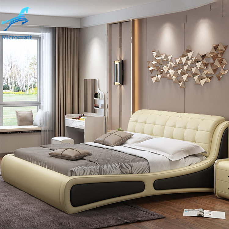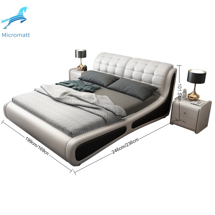 The bed frame is made from high-quality solid wood and upholstered in luxurious leather for durability and style.