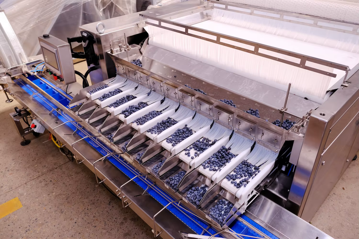 The machine is ideal for blueberry processing plants, berry sorting and grading, and food quality control.