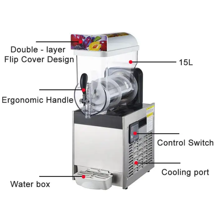This slush machine is ideal for small cafes, bars, parties, events, convenience stores, and snack shops.