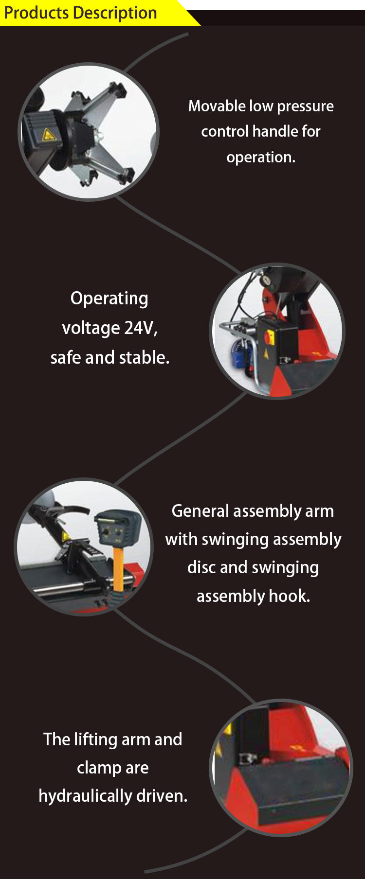 The tire changer includes safety features such as emergency stop buttons, protective guards, and non-slip feet to ensure safe operation.