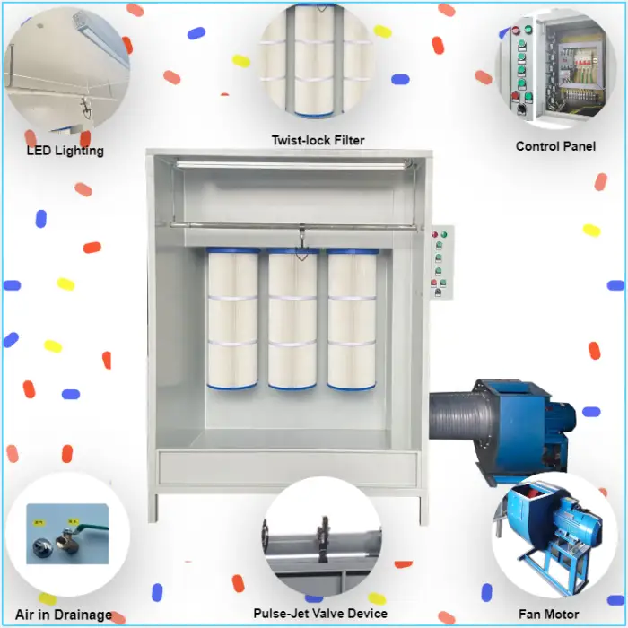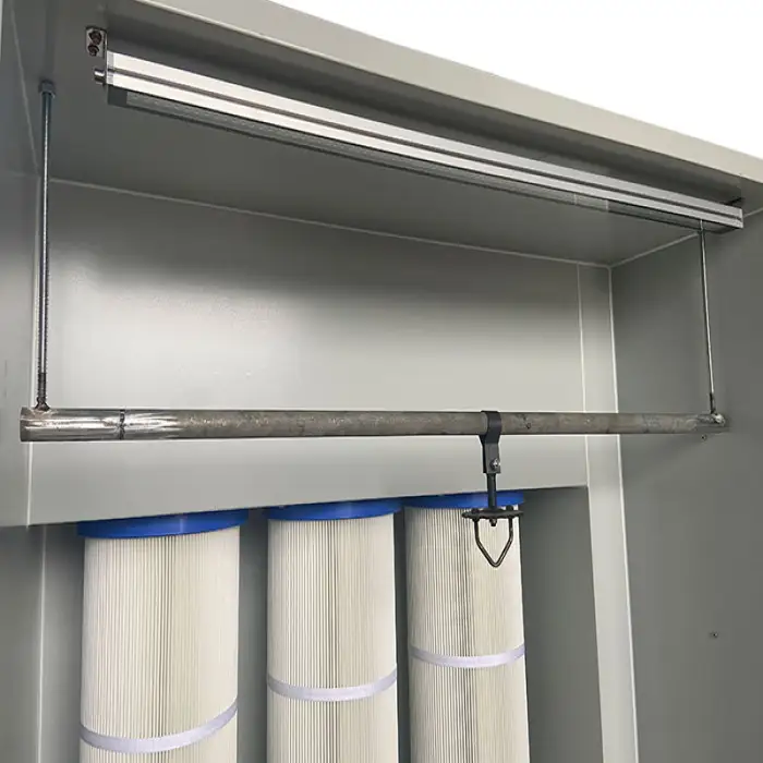 The cartridge filter powder recovery system effectively collects unused powder, ensuring a clean workspace and maximizing material usage.