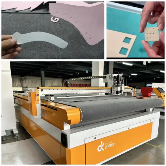 This cutting machine is designed to cut a variety of materials including leather, PVC foam boards, gaskets, and various fabrics used in the textile industry.
