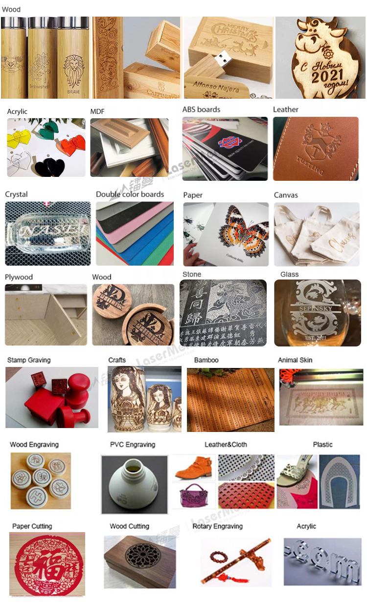 The machine is optimized for non-metallic materials including leather, fabric, rubber, foam, acrylic, wood, MDF, paper, stone (surface engraving), and glass (surface engraving). Avoid cutting materials that contain chlorine (e.g., PVC/vinyl) or highly reflective metals—these can produce toxic gases or damage the laser tube.