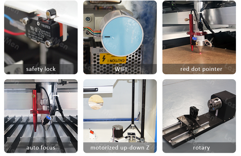 Optional upgrades may include a red dot pointer for easy positioning, motorized up-down worktable, rotary attachment for cylindrical items, auto-focus module, and WIFI connectivity for wireless file transfer. Availability depends on the chosen model and vendor.
