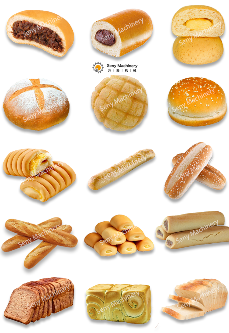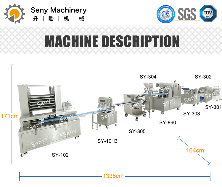 The production line includes multiple machines for automated bread production: SY-301 Auto Dough Mixer, SY-302 Dough Pressing Machine, SY-303 Dough Dividing Machine, SY-860 Bread Forming Machine, SY-305 Round Cutter, SY-101B Auto Table Cutter and SY-102 Auto Tray-arranging Machine. The line is supplied with a 32-tray oven (specifications and heating type configurable—confirm with the supplier).