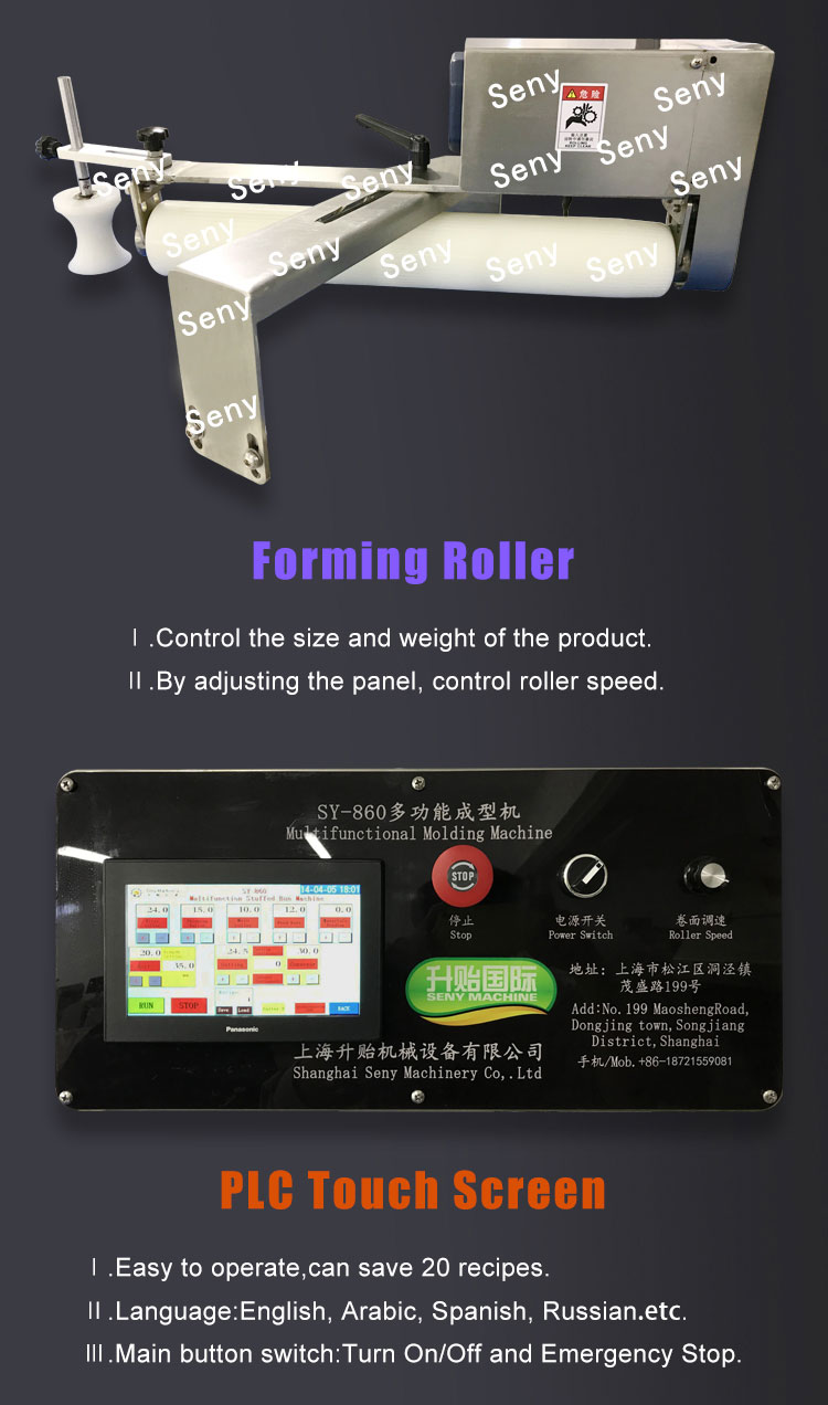 Capacity depends on product size and line configuration. The SY-860 forming machine and related cutters list an output up to 20–120 pcs/min; at the maximum that equates to up to 7,200 pcs/hour. Mixer output is listed as 75 kg per batch and the divider at 15 kg per cycle — actual throughput depends on batch cycle time and product weight (line supports product weights from about 10 g to 650 g).