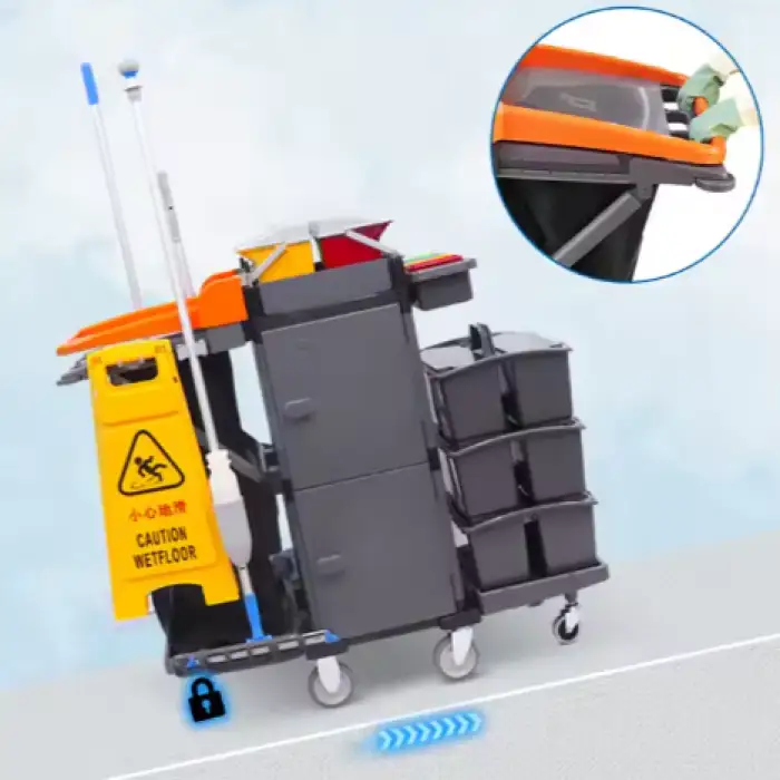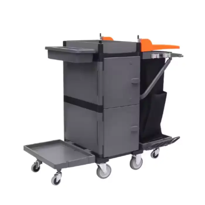 The trolley features spacious storage compartments, allowing for efficient organization of cleaning supplies and equipment.