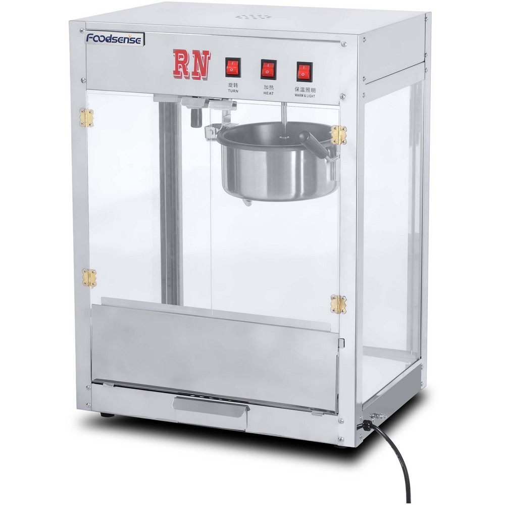A commercial hot air popcorn machine uses heated air (instead of oil) and an internal stirring mechanism to pop kernels quickly and cleanly, producing popcorn suitable for cinemas, concessions, events and retail environments.