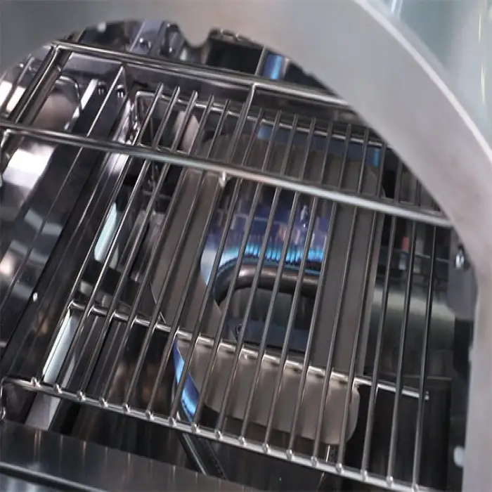 The oven is constructed from high-quality stainless steel, ensuring durability and long-lasting performance.