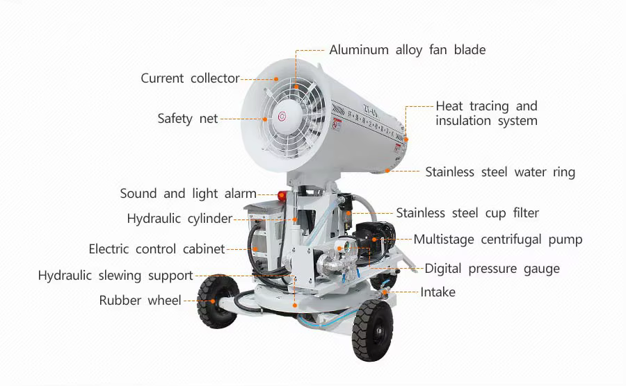 The Construction and Demolition Site Dust Removal Spraying Cannon Machine is constructed from durable metal and stainless steel.