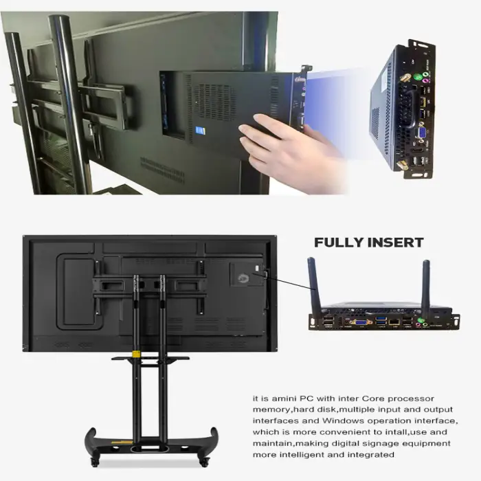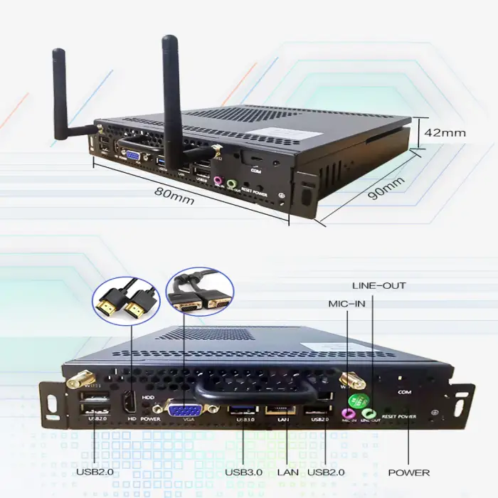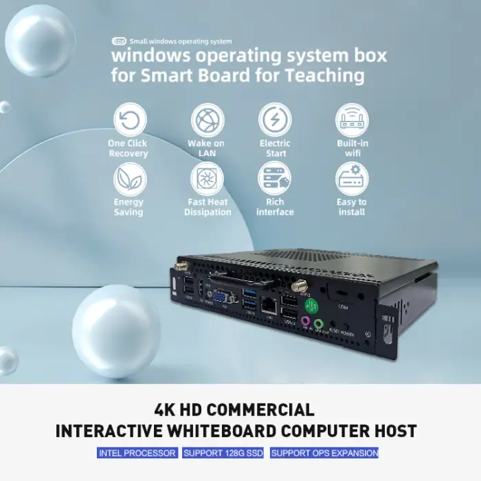 The Mini OPS PC includes multiple connectivity options such as VGA, HDMI, USB, RJ45, COM, and audio ports.
