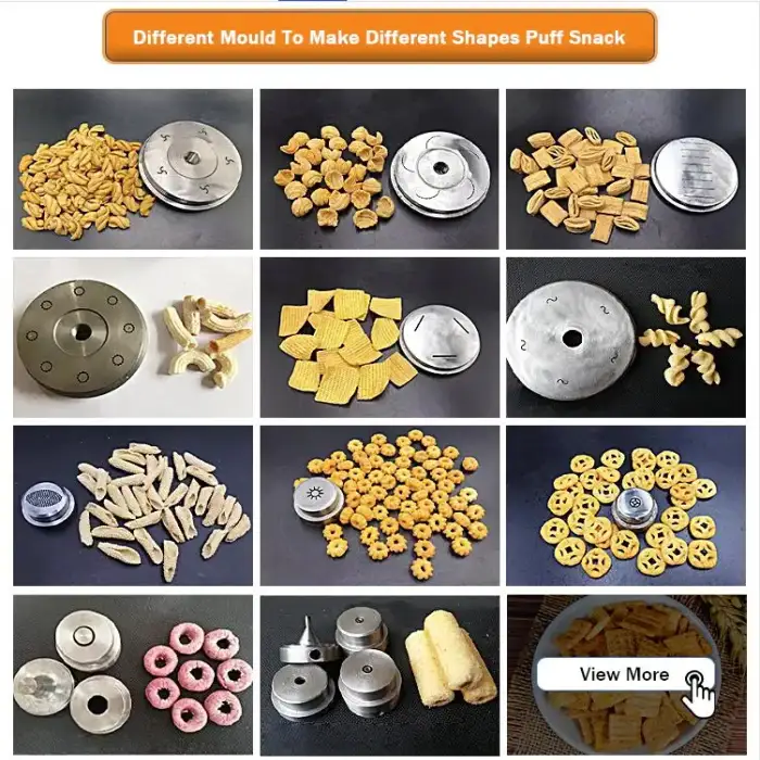 The Core filling food production line can produce puff snacks and corn filling snacks using raw materials like corn flour, rice flour, wheat flour, sugar, and oil.