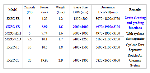 The machine has a capacity of 5 tons per hour for wheat, and it can clean between 2000 to 3000 kg/h for other grains.