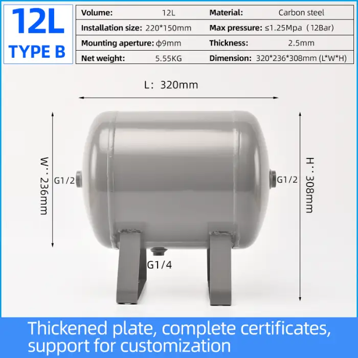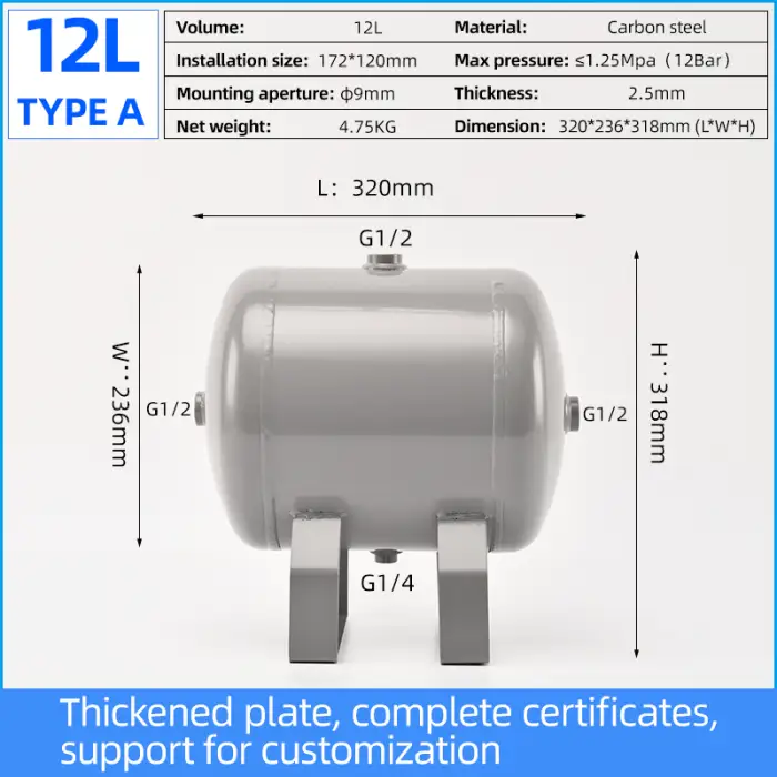 The tank has a capacity of 12 liters, making it suitable for various gas storage needs.