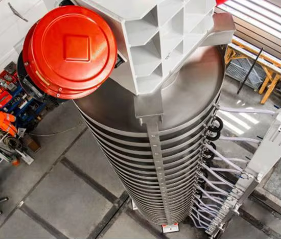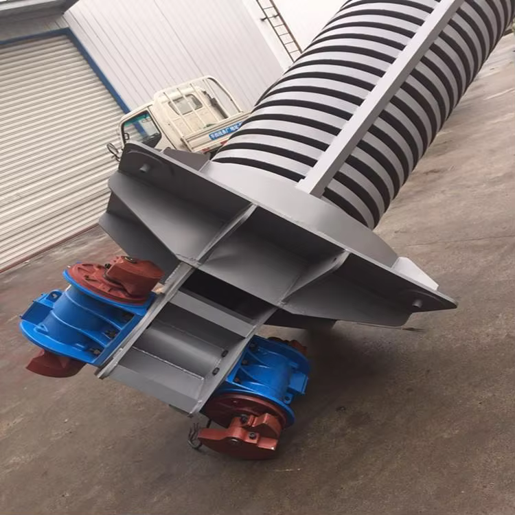 The conveyor operates using a chain lift mechanism combined with a vertical screw, efficiently transporting materials upward.