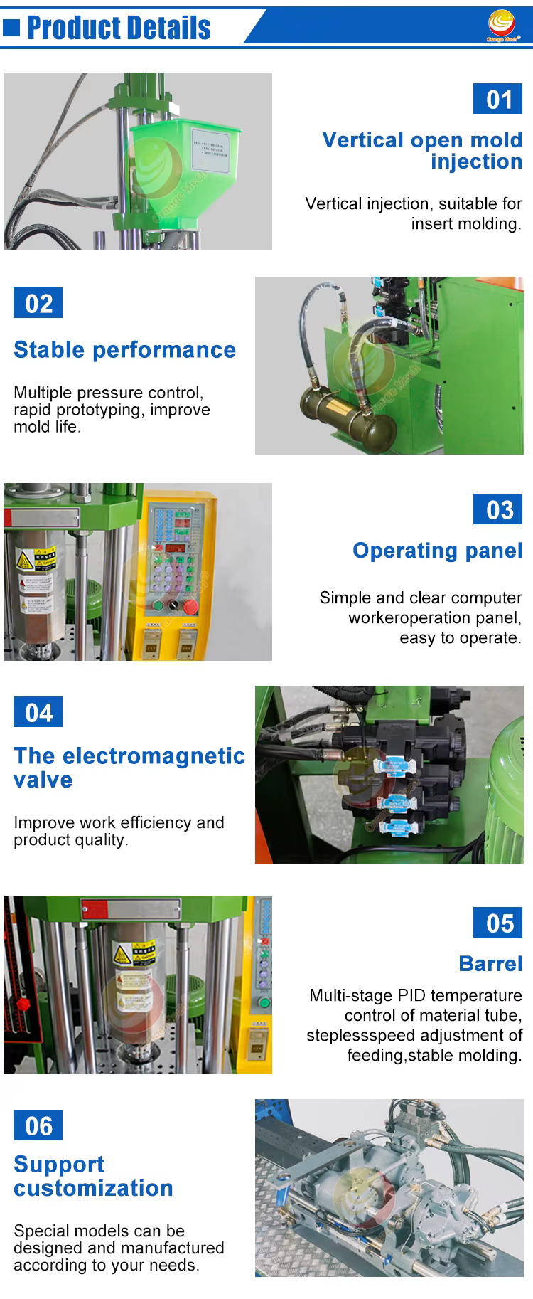 The ORME Desktop Injection Molding Machine has a vertical injection molding structure.