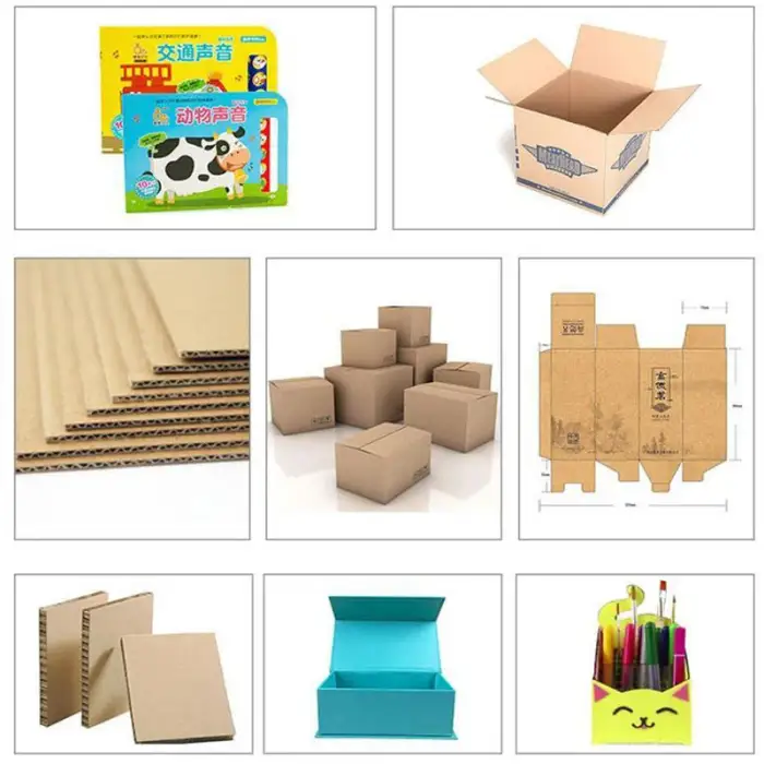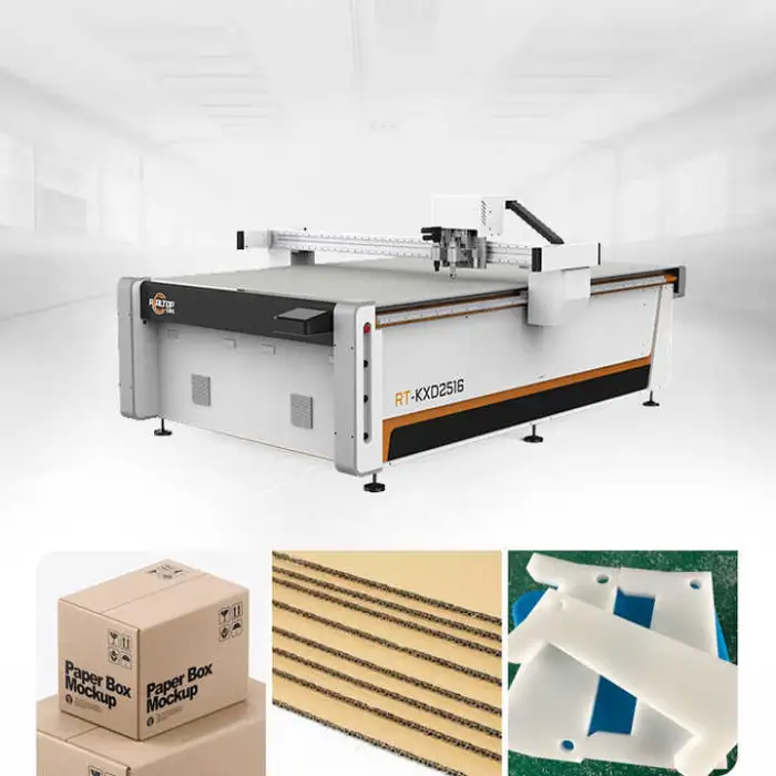 The machine is designed to cut multiple materials including carton boxes, plastics, fabrics, and other soft materials.