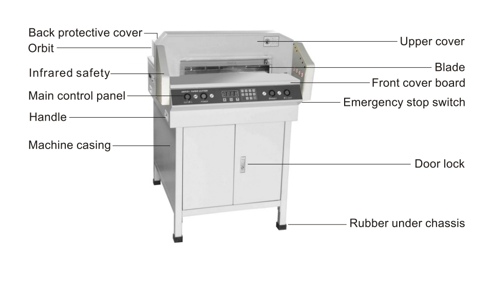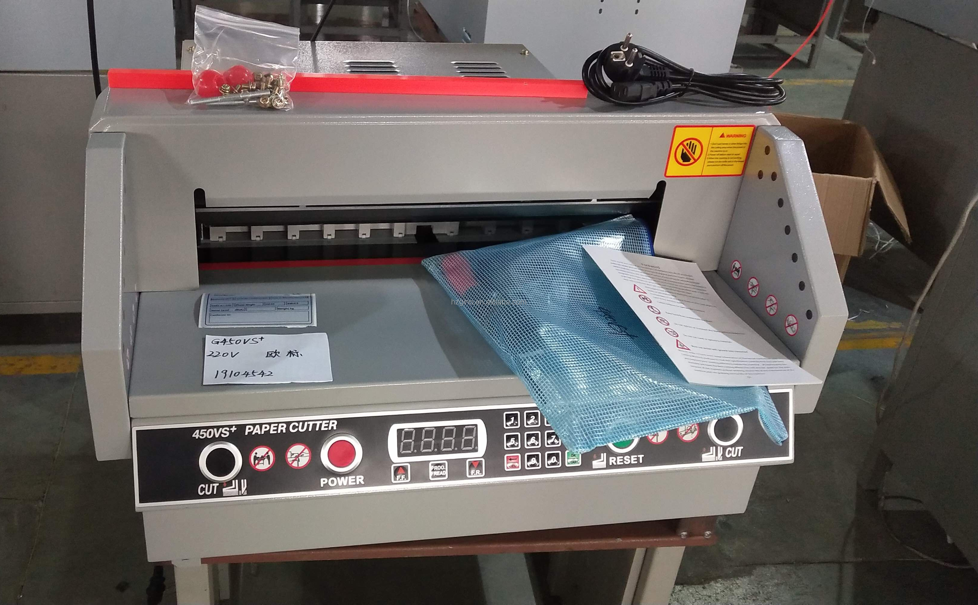 The G450VS+ is an electric, numerically controlled A3-size guillotine paper cutting machine designed for office and light production use. It features automatic paper pressing, a numerical-control circuit for precise positioning, safety guards, an optical cutting line, and a spin cutter with depth-curve technology.