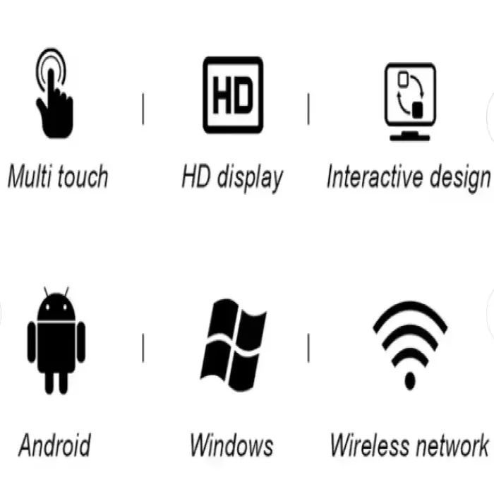 Key features include a large interactive touch screen, high-resolution display, fast response times, and a durable design with high-intensity aluminum and glass.