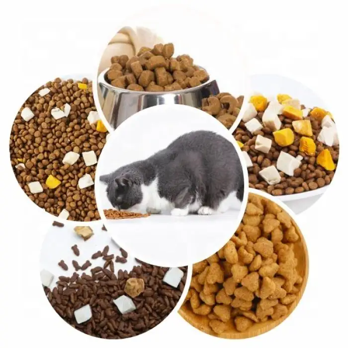 The machine is suitable for various pet food types, including dry dog food, cat food, and pet treats.