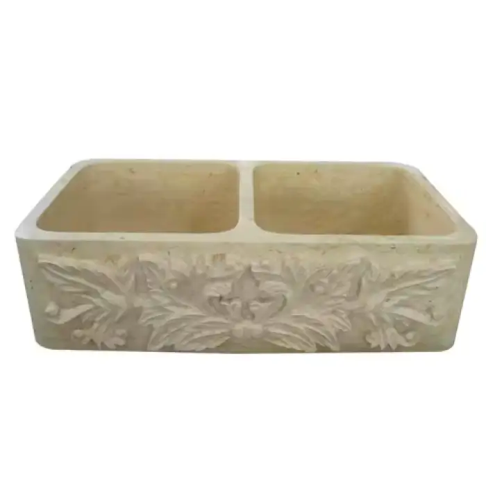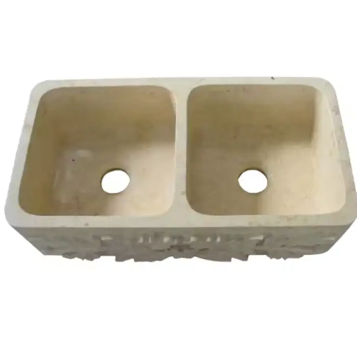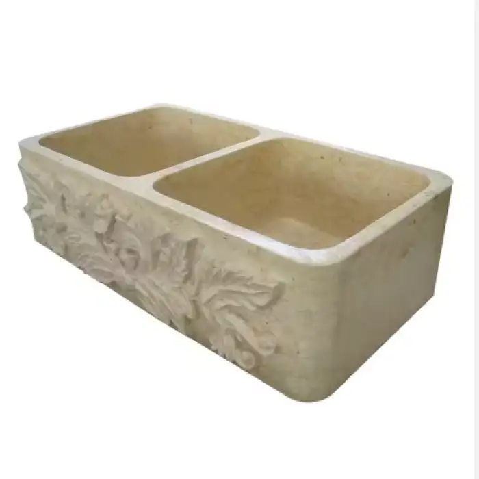 The sink is made of elegant cream marble with a polished finish.