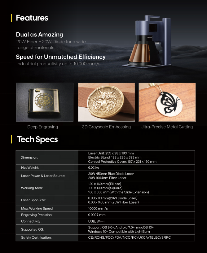 Dual Diode & Fiber Laser Engraving Machine LaserPecker LP5 Precision Marking 20W Deluxe 3D Deep Laser Engraving Machine