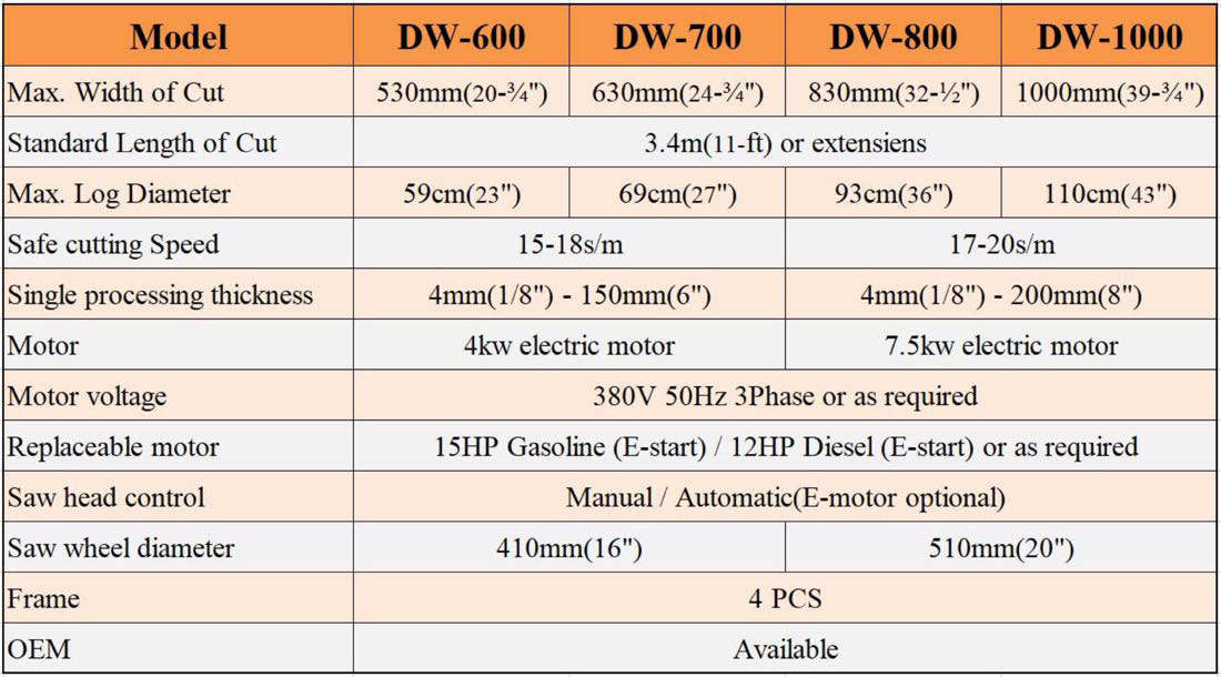 The DW600 bandsaw sawmill can handle logs up to a specified diameter, making it suitable for both small and large timber processing.