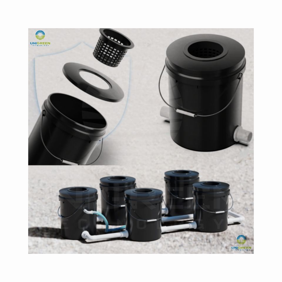 The system includes five buckets, but size options of 8 and 10 buckets are also available.