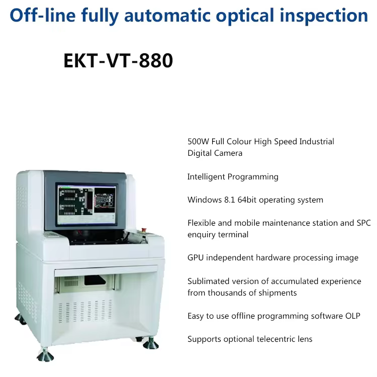 The EKT-VT-880 is designed for high-quality PCB inspection, ensuring accuracy in the inspection of SMT components and circuit boards during the manufacturing and assembly process.