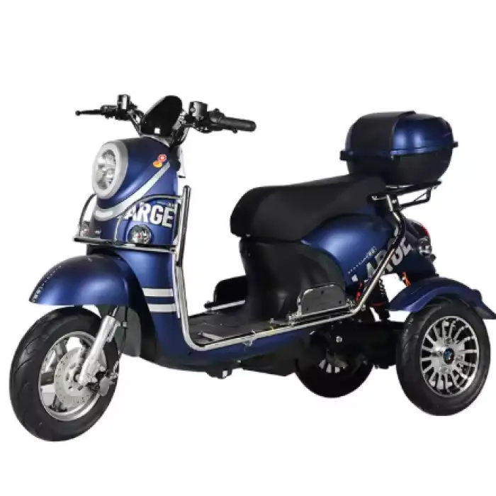 This electric vehicle features a three-wheel design, providing extra stability and safety.