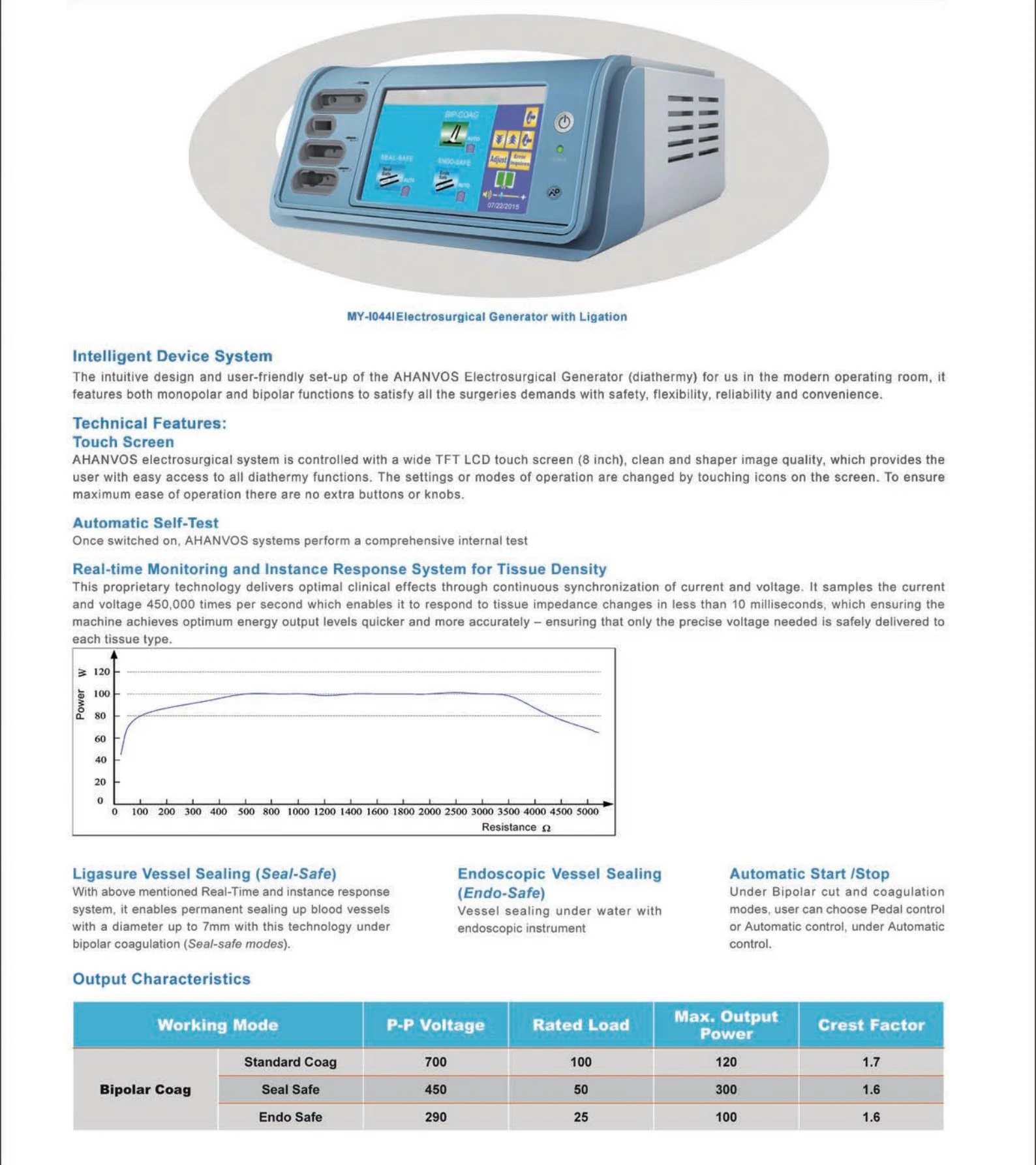 This electrosurgical generator has a maximum continuous output power of 350W, allowing for effective vaporization and coagulation.