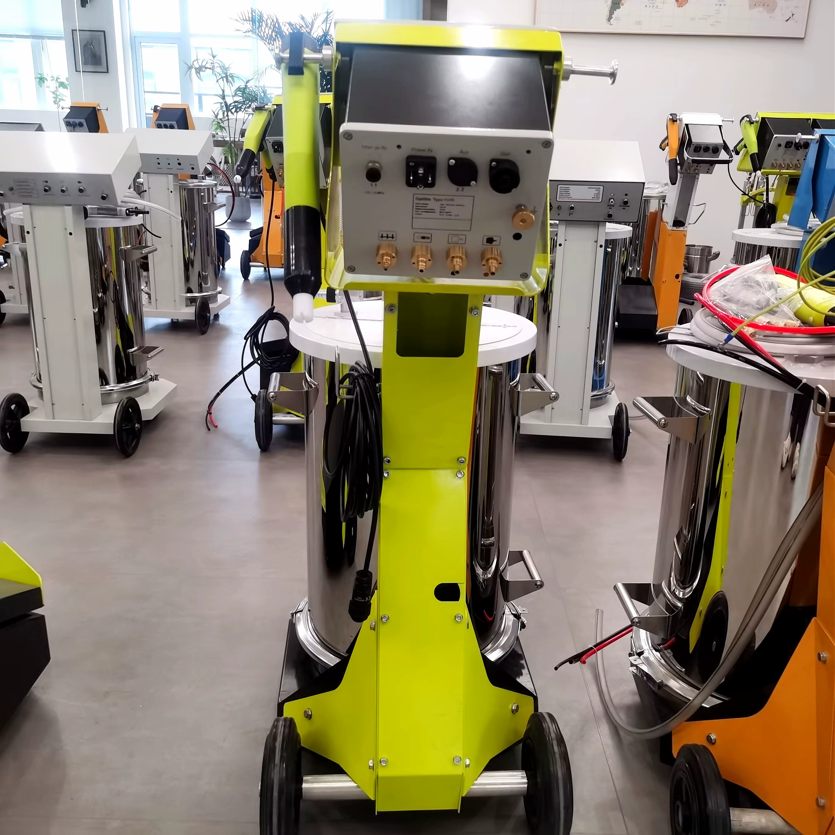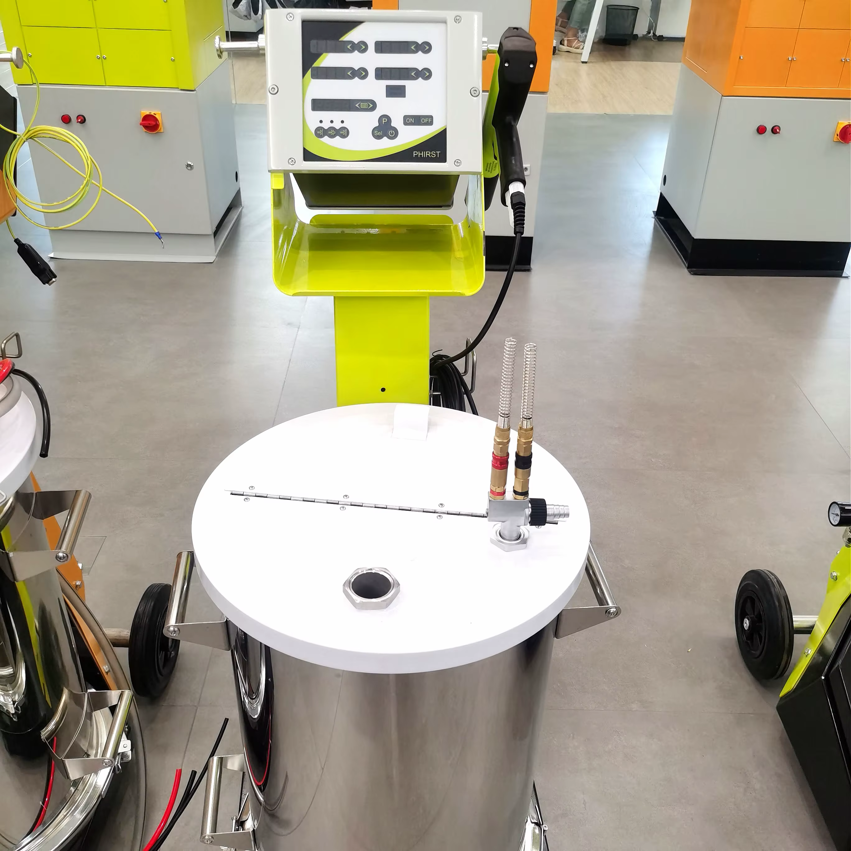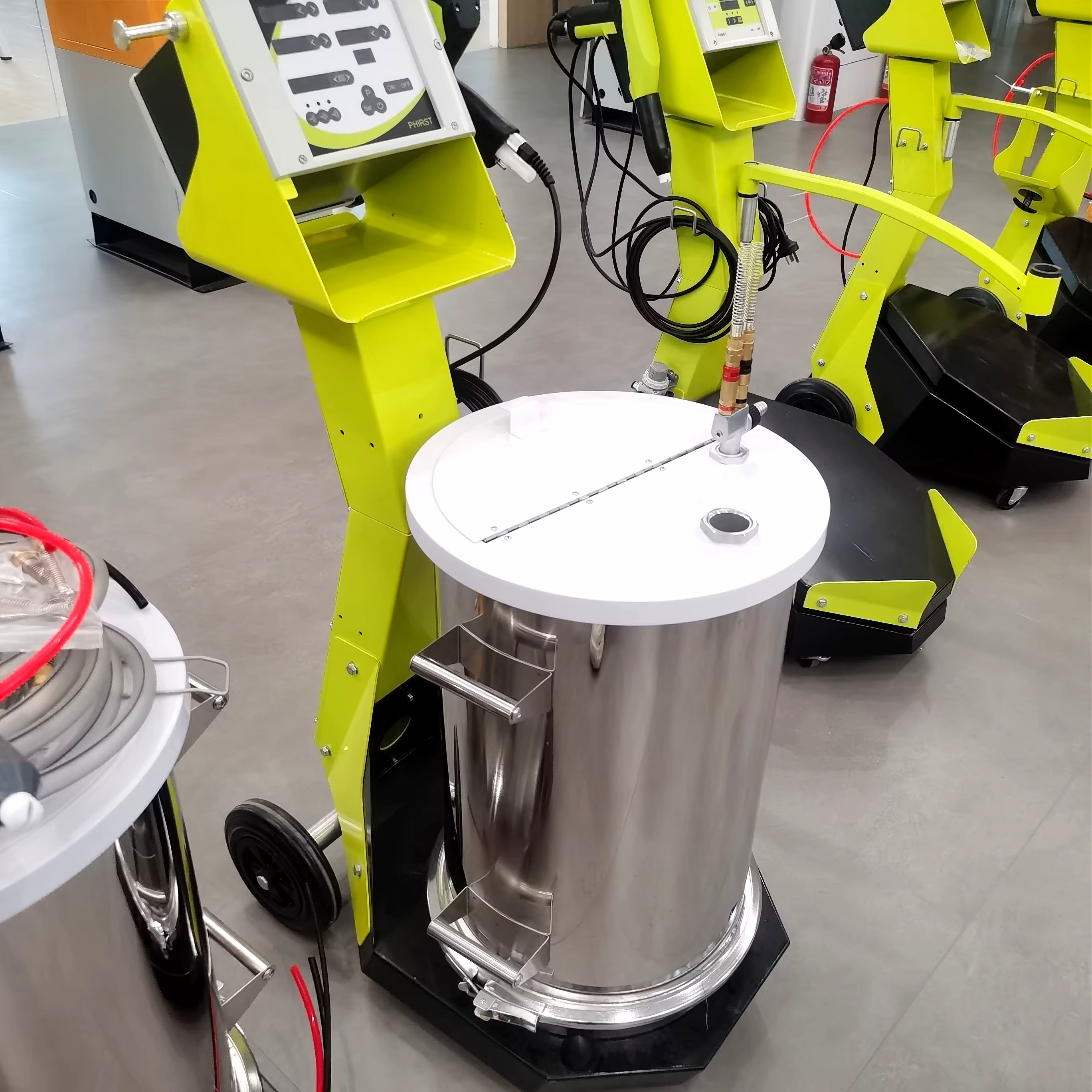 The machine's high productivity design and advanced electrostatic technology allow for fast application and even coverage.