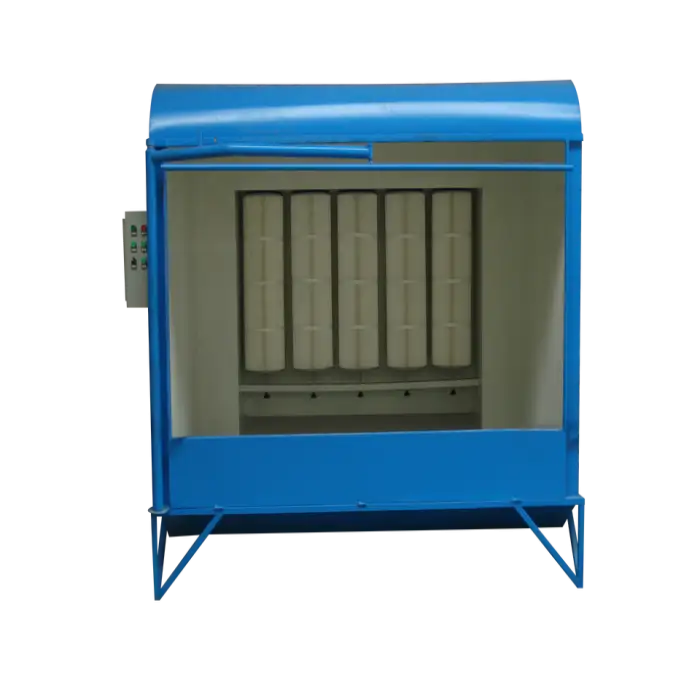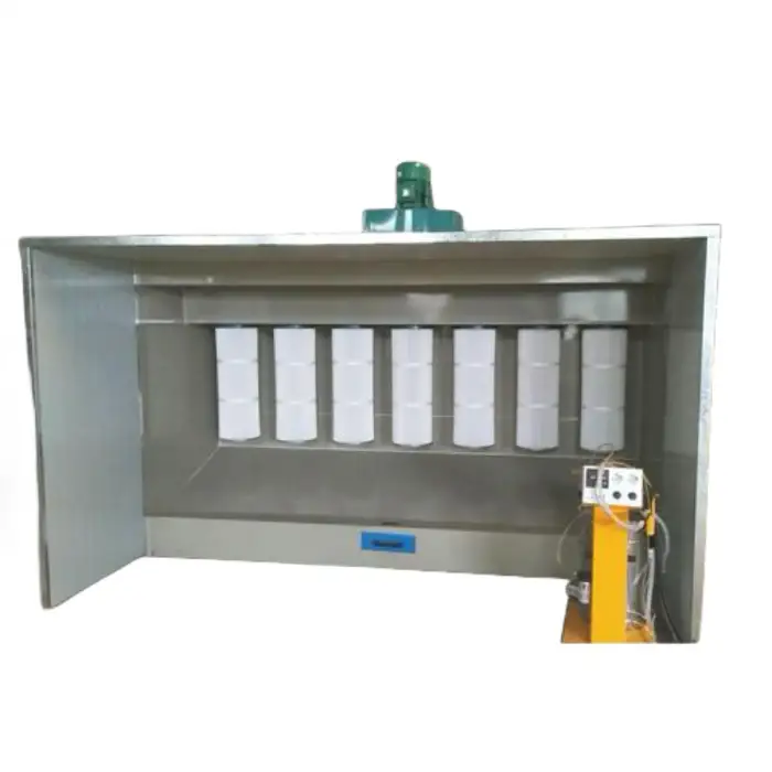 The booth utilizes a filter cartridge system that efficiently recycles excess powder, minimizing waste and improving cost-effectiveness.