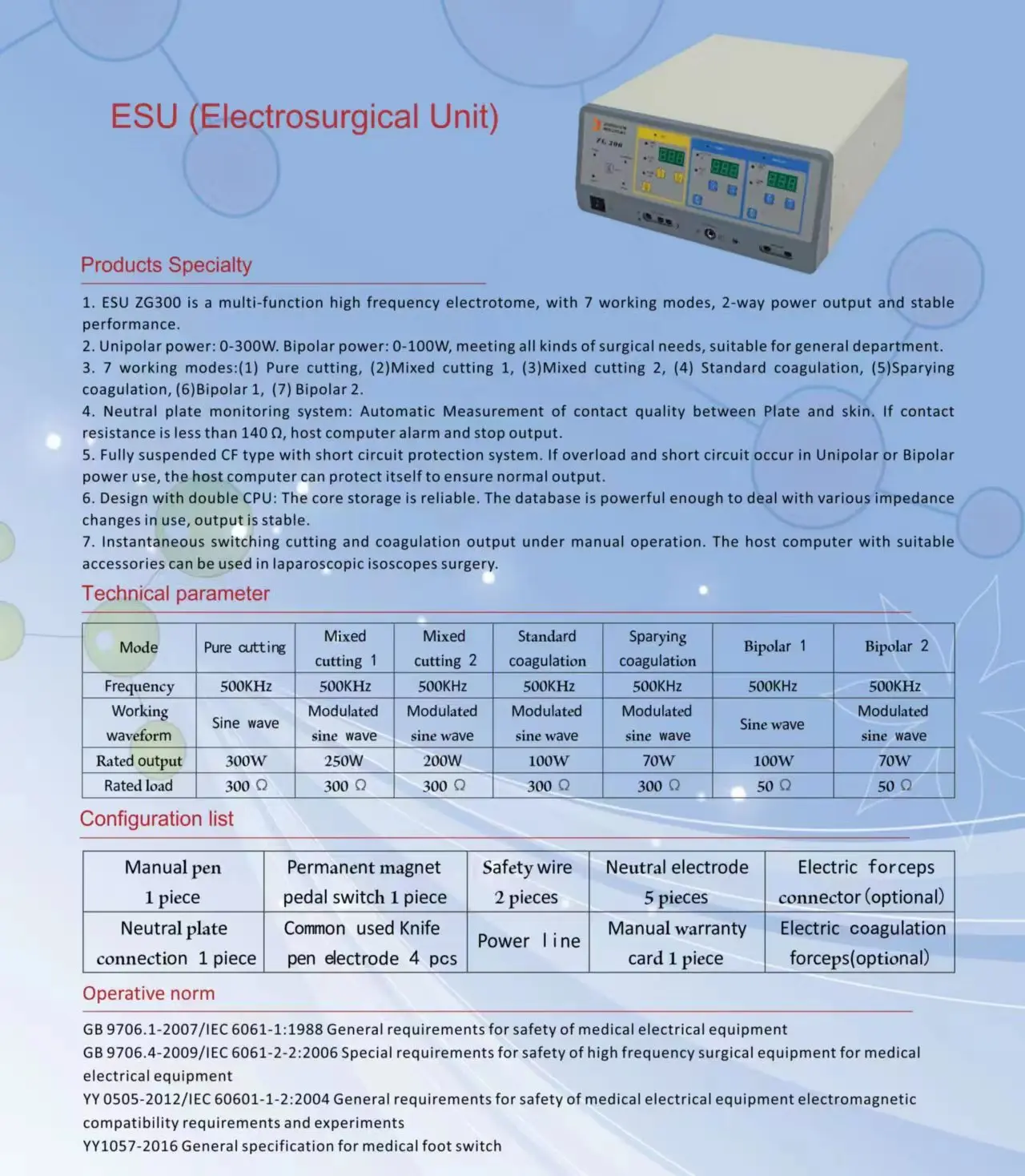 The Electrosurgical Unit provides a pure rated power of 250W, making it suitable for a wide range of surgical procedures.