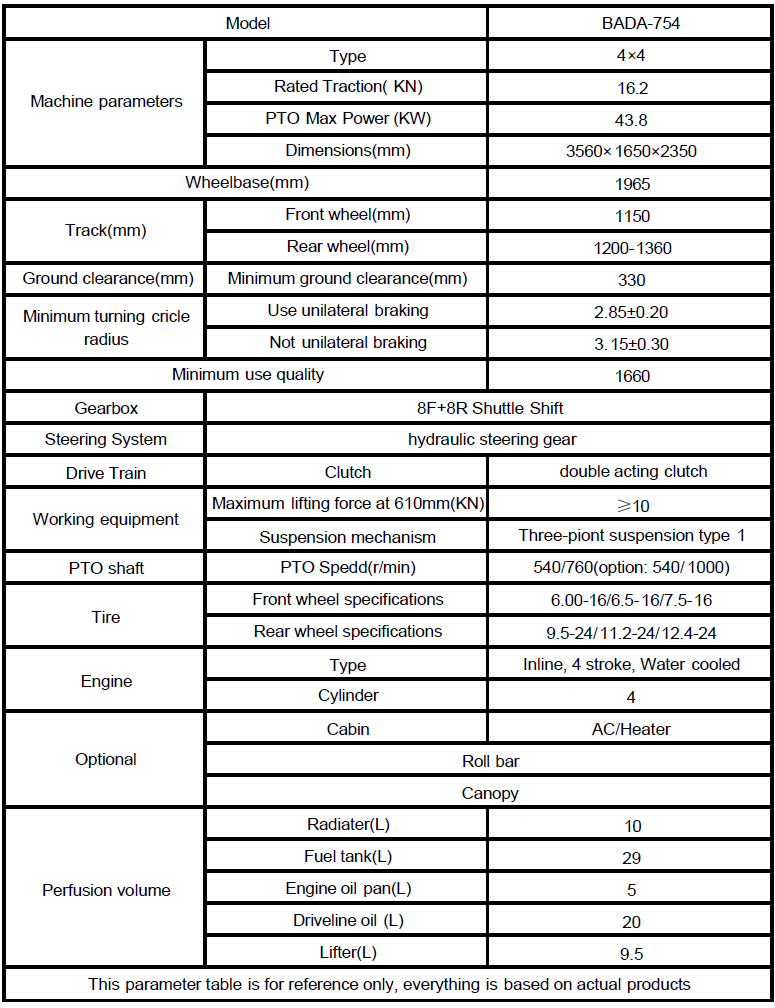 The BADA 754 typically uses 14.9-28 rear tires and 7.5-16 front tires, providing excellent traction for various terrains.