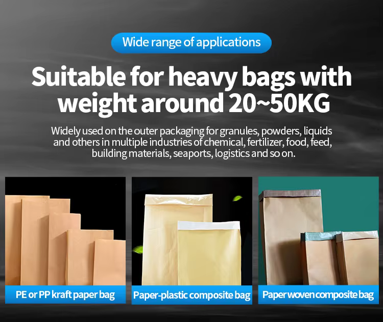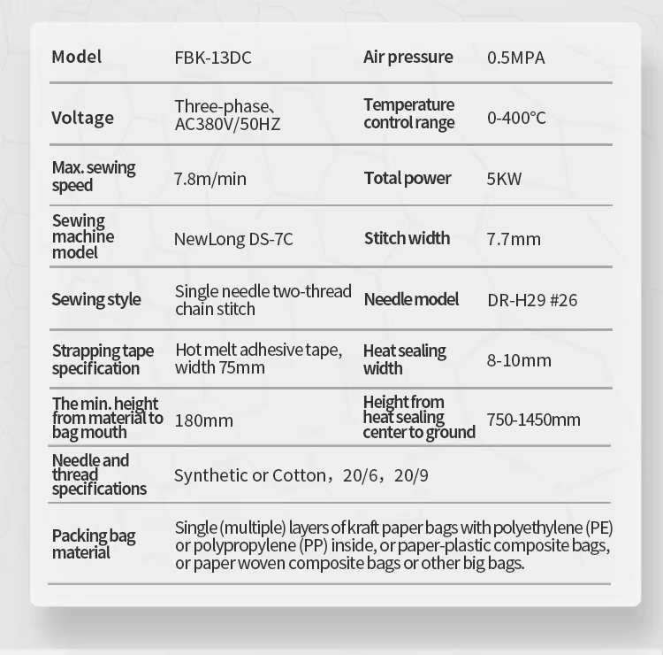 The FBK-13DC is designed to seal various types of multi-layer paper bags, making it suitable for applications in food packaging, beverage sealing, commodity packing, chemical product sealing, and textile packaging.