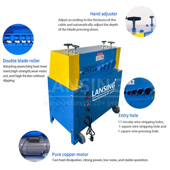 Key features include automatic wire stripping, ability to process various cable sizes, durable blades, and a compact size for easy placement in workshops.
