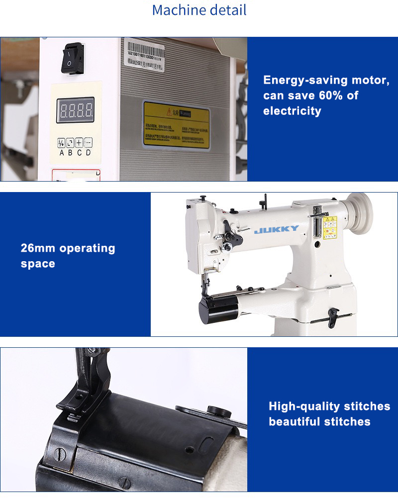 The FH 8B Sewing Machine is powered by a motor that is driven by a synchronous cog belt, ensuring smooth and efficient operation.