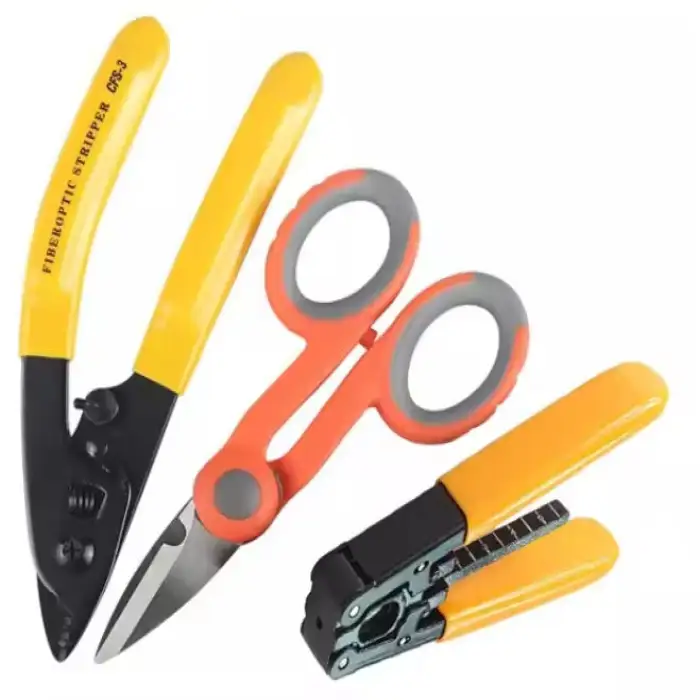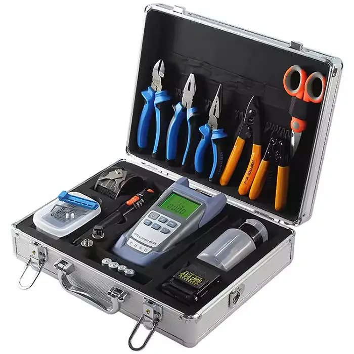 The kit includes an Optical Power Meter, Visual Fault Locator (VFL), Fiber Cleaver, Stripper, Cutter, and other essential tools for fiber optic installation and testing.