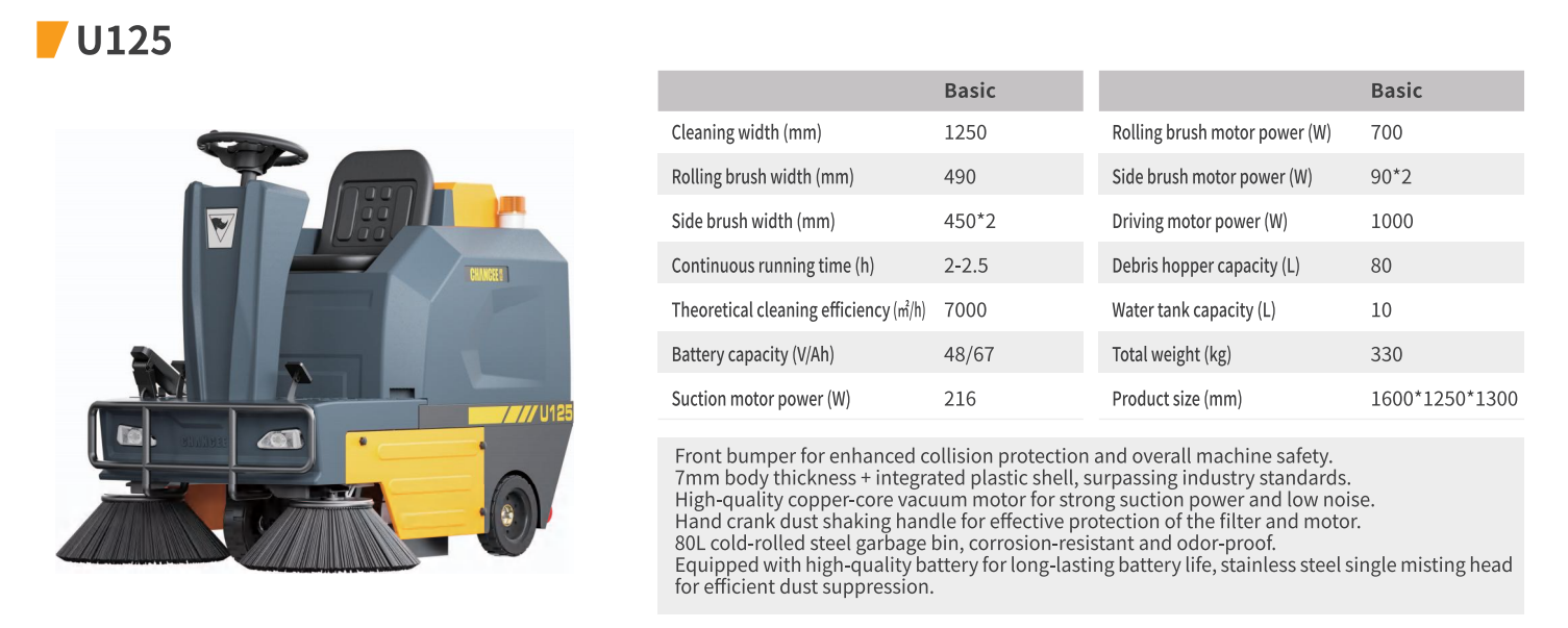The U125 operates at a noise level of approximately 65 dB, making it relatively quiet compared to traditional sweepers.