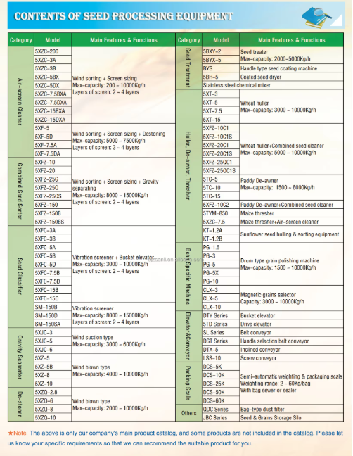 Key features include a multifunctional design for efficient seed cleaning, wind sorting, screen sizing, gravity separating capabilities, and durable core components.