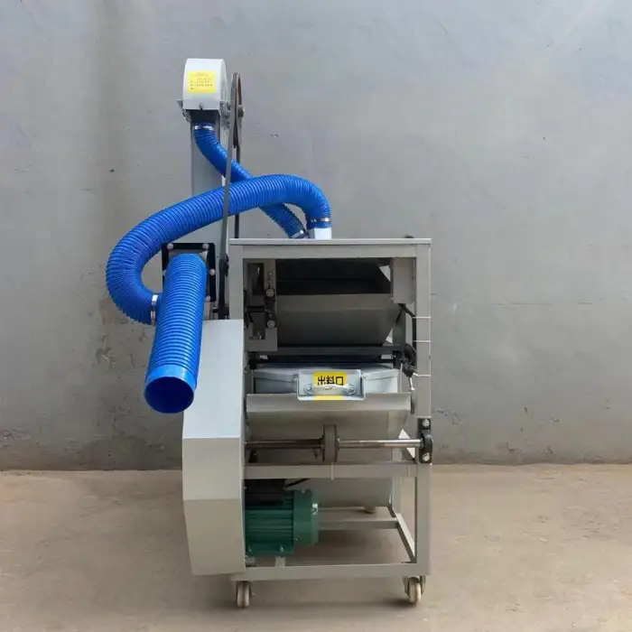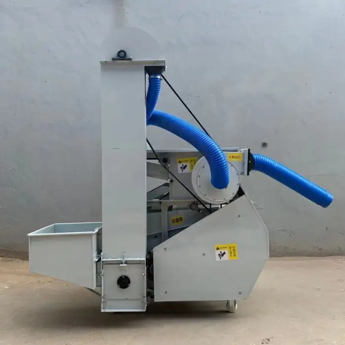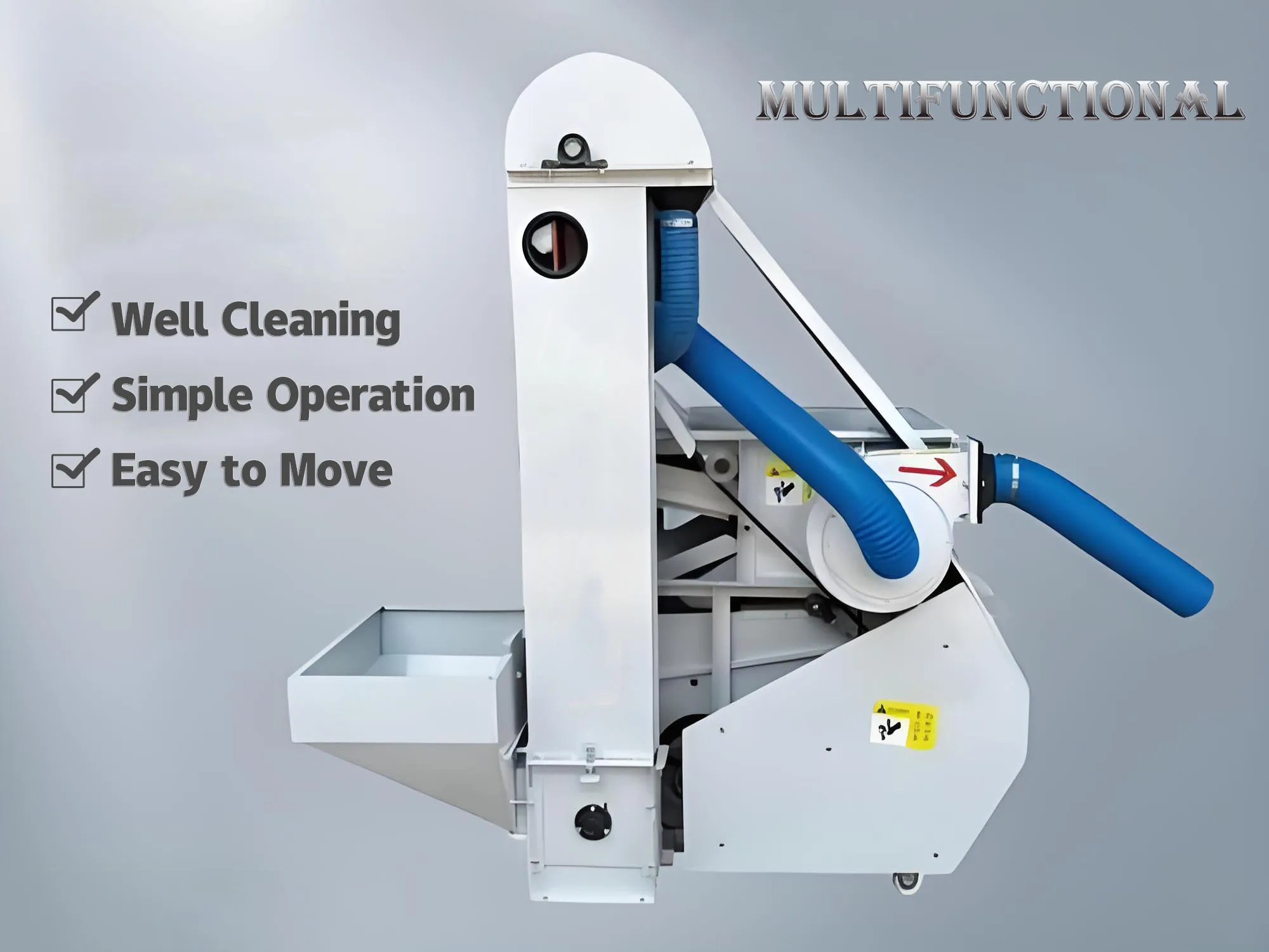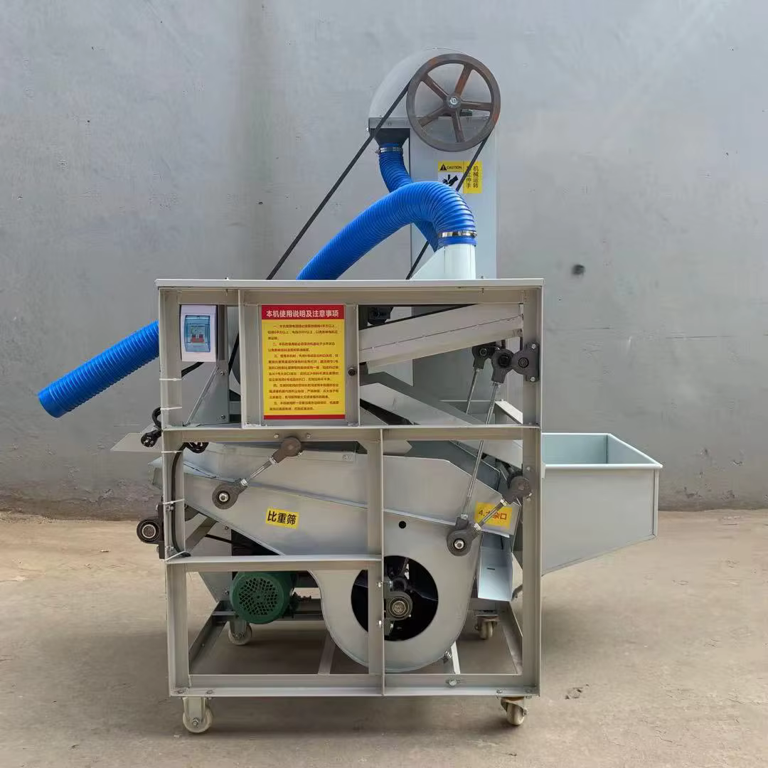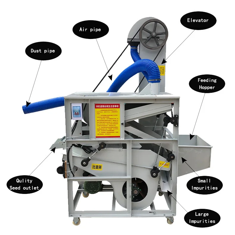 The machine operates through a combination of wind sorting, screen sizing, and gravity separation to effectively clean seeds.