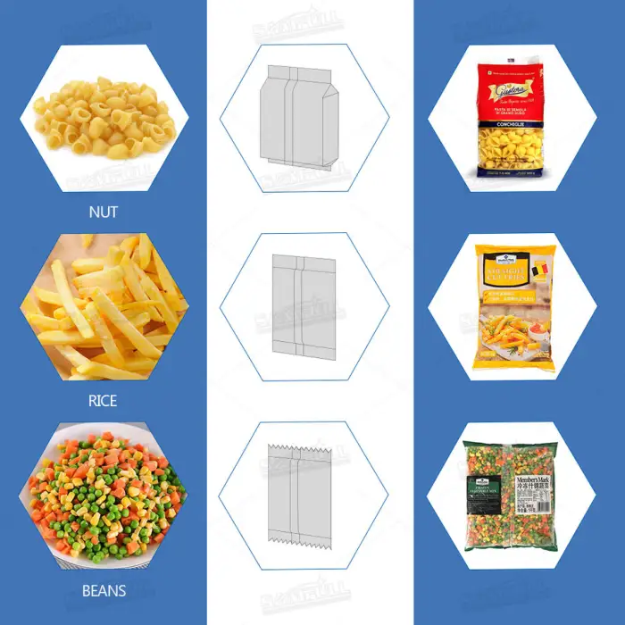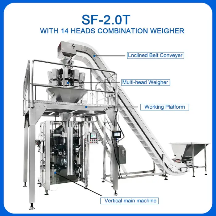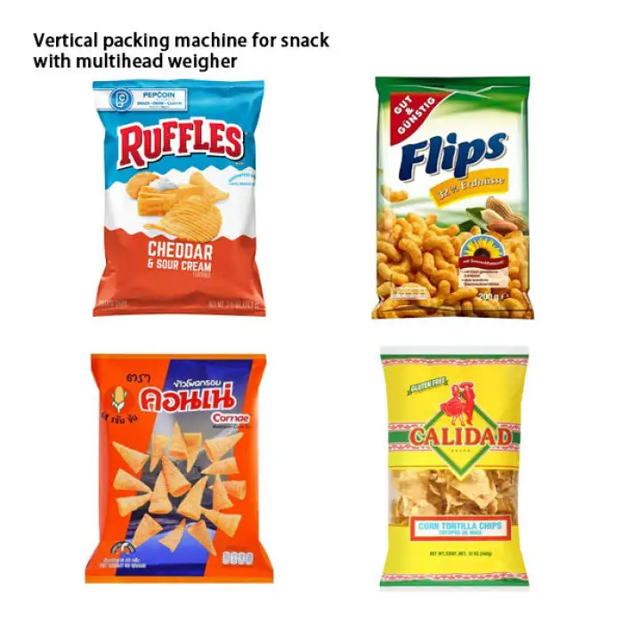 The Full Automatic Vertical Multihead Weigher can package pillow bags, standup pouches, and gusset bags.